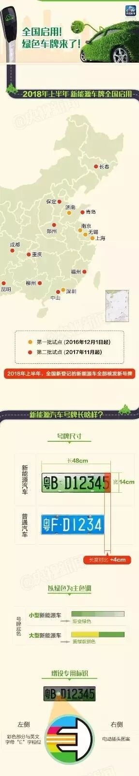 1、2016年12月1日起,上海、南京、无锡、济南、深圳5个城市率先试点启用了新能源汽车专用号牌